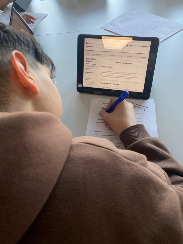 Auch hier werden sie von Frau Stiller begleitet und können an verschiedenen Stationen, Berufe raten, sich an einem Einstellungstest ausprobieren oder online nach ihrem Traumjob recherchieren. ,,Das hat richtig Spaß gemacht", sagt eine Schülerin aus der 9a am Ende des Besuchs.